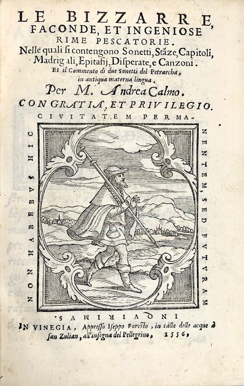 Il Calmo (1510/11-1571) fu attore e commediografo presumibilmente della piccola borghesia veneziana. Tra i suoi amici figurano A.F. Doni, Pietro Aretino e il Tintoretto. E' qui assai ampia la raccolta di cheribizzi e fantasie, indirizzati in forma di lettere da presunti pescatori a destinatari illustri o fittizi e a cortigiane. Animati da figure popolari e burlesche, ricordano alcune opere del Ruzzante e del Parabosco e hanno vari passsaggi in dialetto veneto. Sull'uso almeno in parte teatrale delle Lettere calmiane non sussistono dubbi, esse vengono spesso ricordate in documenti concermenti il teatro dell'arte come opera di repertorio, alla quale i comici attingevano monologhi, concetti e battute. Esemplare ben conservato, seconda edizione non comune. Brunet, I, 1497 ; Fowler, p. 244 .