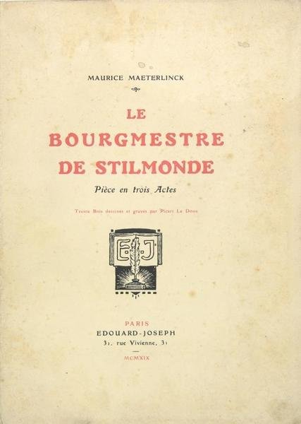 Editions Edouard Joseph, Paris, 1919. In-8 (20 x 14 cm) broché, couverture imprimée, illustrations de Picard Ledoux (30 bois), 178 pages. Exemplaire numéroté sur vélin Lafuma de Voiron (n°704). Rousseurs surtout sur la couverture et les tout premiers feuillets. Monod 7597. Pièce en trois actes.