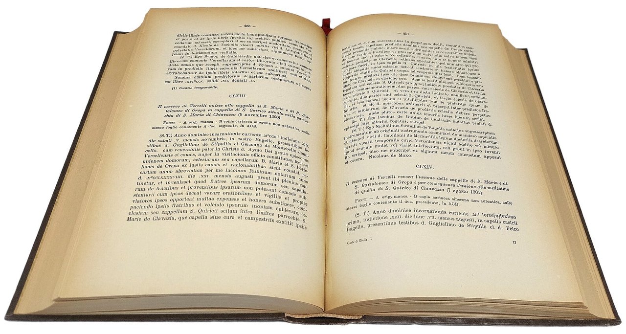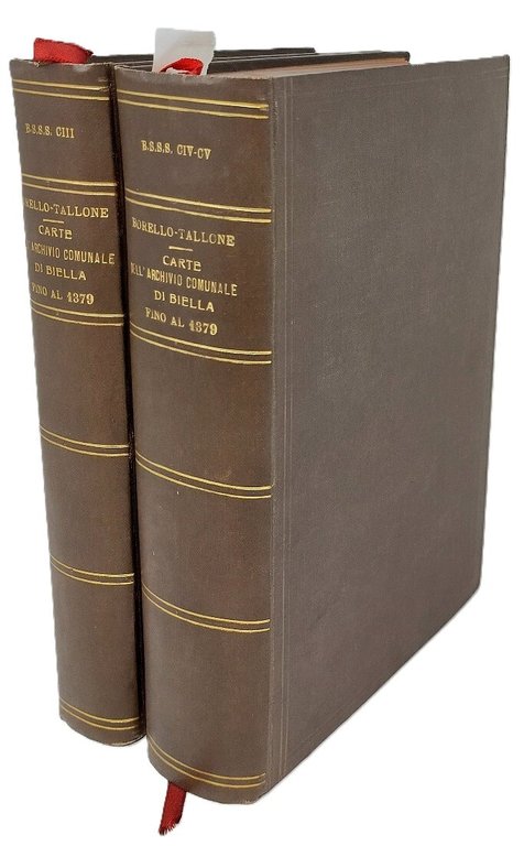 >4 parti in 2 tomi in-8, pp. (6), 495; 556, 166. leg. mod. in similpelle, broch. cons. Il primo vol. comprende i documenti dal 1028 al 1319, il secondo quelli dal 1320 al 1379, raccolta mancante del terzo volume con le appendici, gli indici e un nuovo inventario delle carte seguito al riordino dell'archivio, curato dal solo Borello. (Vol. CIII - CIV - CV e CXXXVI della Bibl. della Soc. Storica Subalpina). Straordinario lavoro archivistico.
