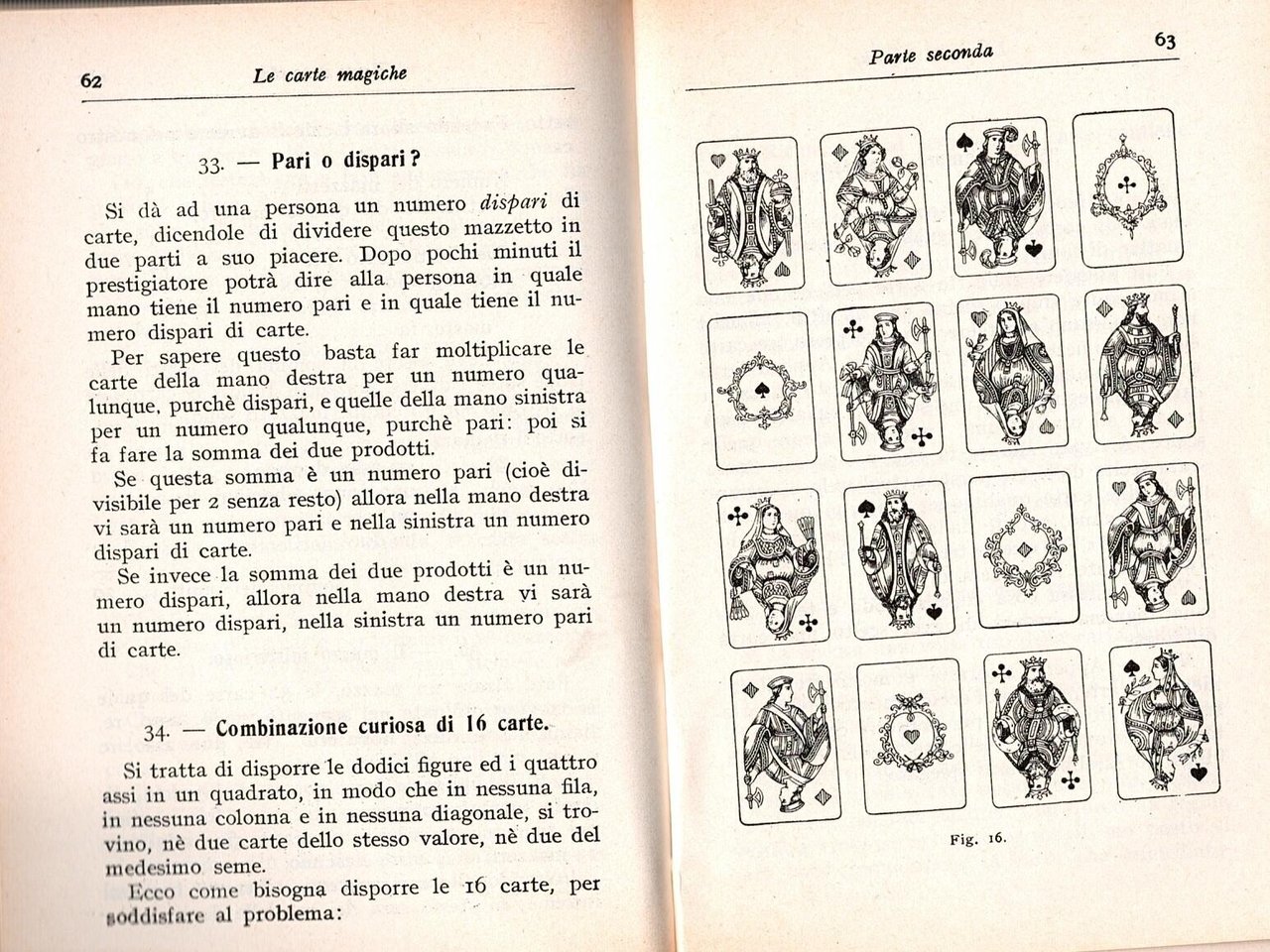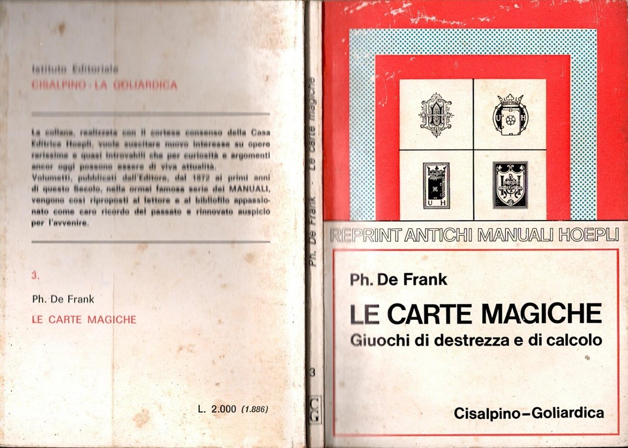 LE CARTE MAGICHE Giuochi di destrezza e di calcolo di Ph De Frank. Cisalpino Goliardica Editore Reprint Hoepli, 1975 . XIV, 157 pagine, numerose illustrazioni in bianco e nero nel testo. Copertina editoriale in brossura. Stato di conservazione: molto buono (pagine normalmente ingiallite) Libro usato saggistica magia prestidigitazione