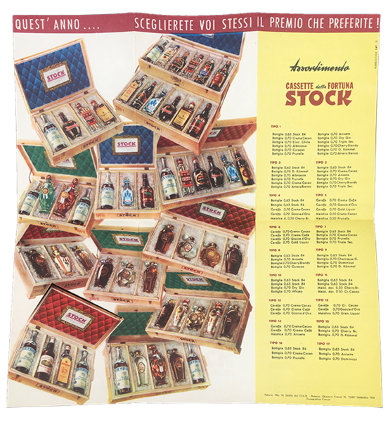 di cm. 16,2x10 (complessivi cm. 31,3x29,6. "Quest'anno sceglierete voi stessi il premio che pereferite!". Nella 6 faccaiate interne le foto a colori di un assortimento di 11 CASSETTE da regalo natalizio contenenti 53 bottiglie di varie eleganti fogge con vari tipi di LIQUORI e, a lato, l'elenco dei contenuti di 17 cassette, la descrizioni con la capacità e il tipo di liquore. Nella facciate esterne: 1) la finestrella-coperchio che si solleva rivelando il contenuto di una cassetta, 2) il lancio della campagna-regali, 3) i vincitori dei 3 anni precedenti, 4) la lista dei premi garantiti a scelta, 5) dei 150 premi a sorte, 6) Norme del Concorso.