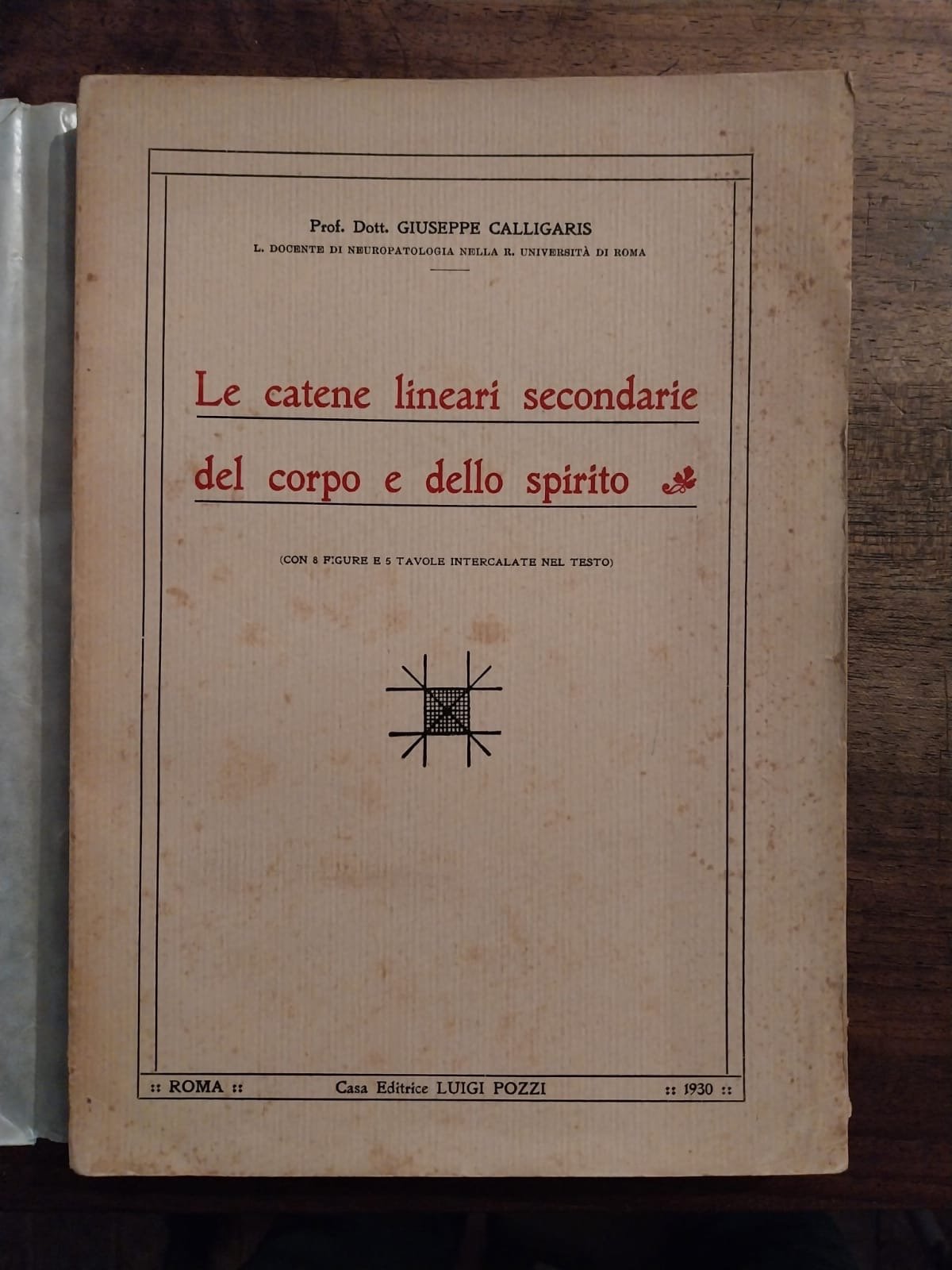 In-8°, pp. 227, 8 tavv. f.t. e 5 illustrazioni n.t., brossura editoriale. Giuseppe Calligaris è nato nel 1876 nella provincia di Udine. Laureatosi a Bologna con una tesi dal titolo 'Il pensiero che guarisce', si trasferisce a Roma per lavorare con il Prof. Mingazzini nel campo della Neuropatologia presso la Regia Università di Roma Rinuncia ad una solida carriera universitaria per dedicarsi completamente alle sue ricerche che gli costarono diverse incomprensioni con i suoi colleghi professori. Il Prof. Calligaris dimostrò che la struttura interna del corpo umano e il tessuto cutaneo che lo riveste sono in relazione tra loro ipotizzando l'esistenza di linee e placche cutanee che corrispondono allo stato mentale del paziente. Ogni stimolazione di un dito o di un arto provoca nel paziente il medesimo riflesso sul corpo e lo stesse sensazioni sul piano spirituale. Morì in povertà nel 1944. Le sue ricerche sulla metafisiologia partono dal tentativo di dare risposta ad un quesito molto pressante nel campo delle neuroscienze. Accade a volte che un certo danno neuronale causi insensibilità su parte della pelle: solo che non vi è un nesso diretto tra la parte del cervello danneggiata e la porzione di pelle interessata. Così ilCalligaris iniziò a fare degli esperimenti sui suoi pazienti, che lo portarono a notare qualcosa che lo interessò subito, diventando il focus delle sue ricerche successive. Il dottore si rese conto che, stimolando certe aree della pelle di una persona, specie dita e spazi tra le dita, era in grado di suscitare degli stimoli sempre uguali, sia fisici che emozionali. Portando avanti questa intuizione, scoprì anche che poteva spingersi ancora oltre e suscitare percezioni extrasensoriali, che esulavano dall'esperienza diretta del soggetto studiato.