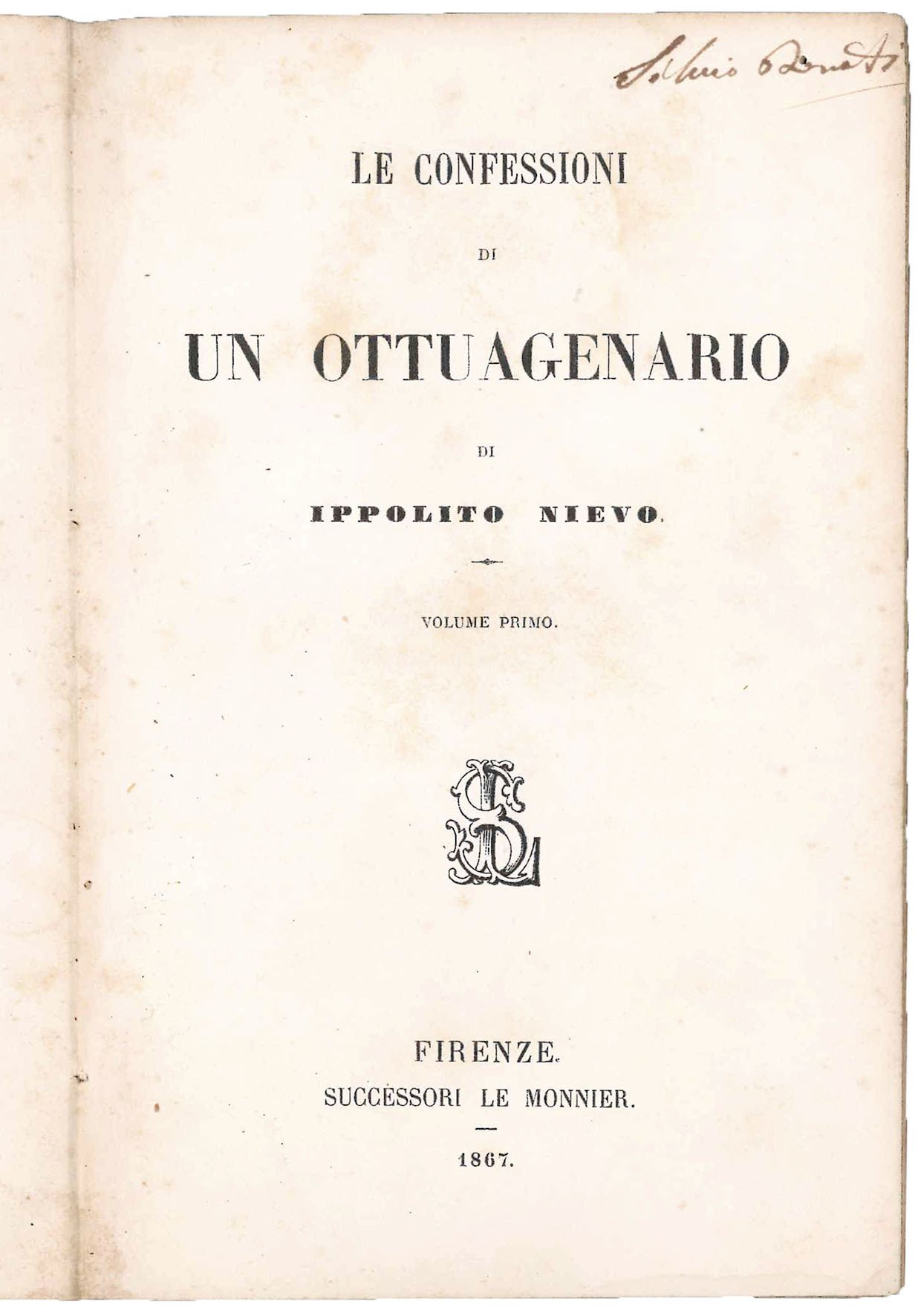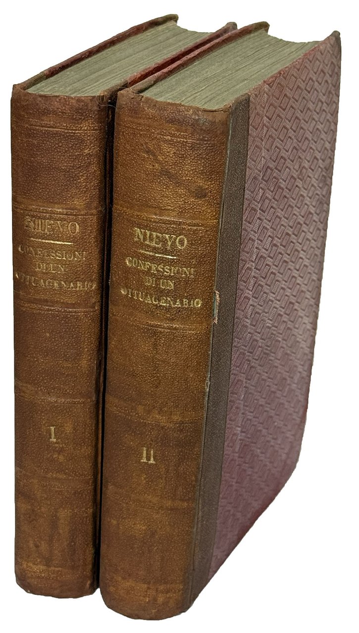 Prima edizione di uno dei maggiori romanzi della letteratura italiana (che assumerà dalle edizioni successive il titolo definitivo di Le confessioni di un italiano), scritto da un giovanissimo Ippolito Nievo in soli otto mesi tra il 1857 e 1858 e poi pubblicato postumo. Nievo morì annegato, non ancora trentenne, durante il viaggio di ritorno dalla Sicilia, dove aveva preso parte all'impresa garibaldina dei Mille, nel naufragio della nave Ercole al largo delle coste sorrentine. L'edizione fu stampata per volere e cura della poetessa Erminia Fuà Fusinato, moglie di Arnaldo Fusinato, che firma anche la lunga poesia che precede il testo, dedicata alla memoria del giovane Nievo. La Fuà Fusinato non si limitò tuttavia a preparare il testo per la stampa, ma introdusse anche “rimaneggiamenti di natura lessicale, grammaticale e sintattica, nonché sostituzioni di parole che le parvero eccessivamente realistiche o audaci” (M. Gorra, IN: I. Nievo, “Confessioni d'un Italiano”, Milano, 1981, p. 1075) Questo capolavoro della letteratura italiana fu paragonato da Benedetto Croce ai Promessi sposi di Manzoni, in quanto scritta in forma di romanzo storico in cui gli accadimenti del Risorgimento si intrecciano con le vicende biografiche del protagonista.