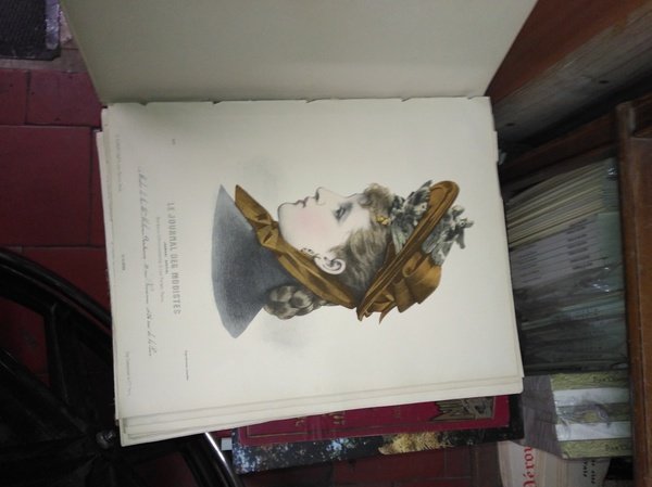 Le Coquet Journal de Mode 1888. In folio reliure demi-basane rouge, dos lisse à triple filets et titres or, 107 gravures couleurs pas de texte.