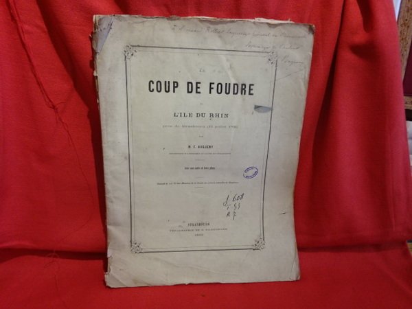 Strasbourg, Typographie de G. Silbermann, 1869; in-4 (241 x 317 mm), 2-40 pp. + 4 pl. hors-texte, broché (dos de couverture fendu et déchiré). Tampon de la Bibliothèque de Salins annulé. Extrait du vol. VI des Mémoires de la Société des Sciences naturelles de Strasbourg. Envoi de l'auteur, professeur de Physique au Lycée de Strasbourg, à M. Rother, inspecteur général de l'Université. Illustrations en noir et blanc (une carte et trois plans).