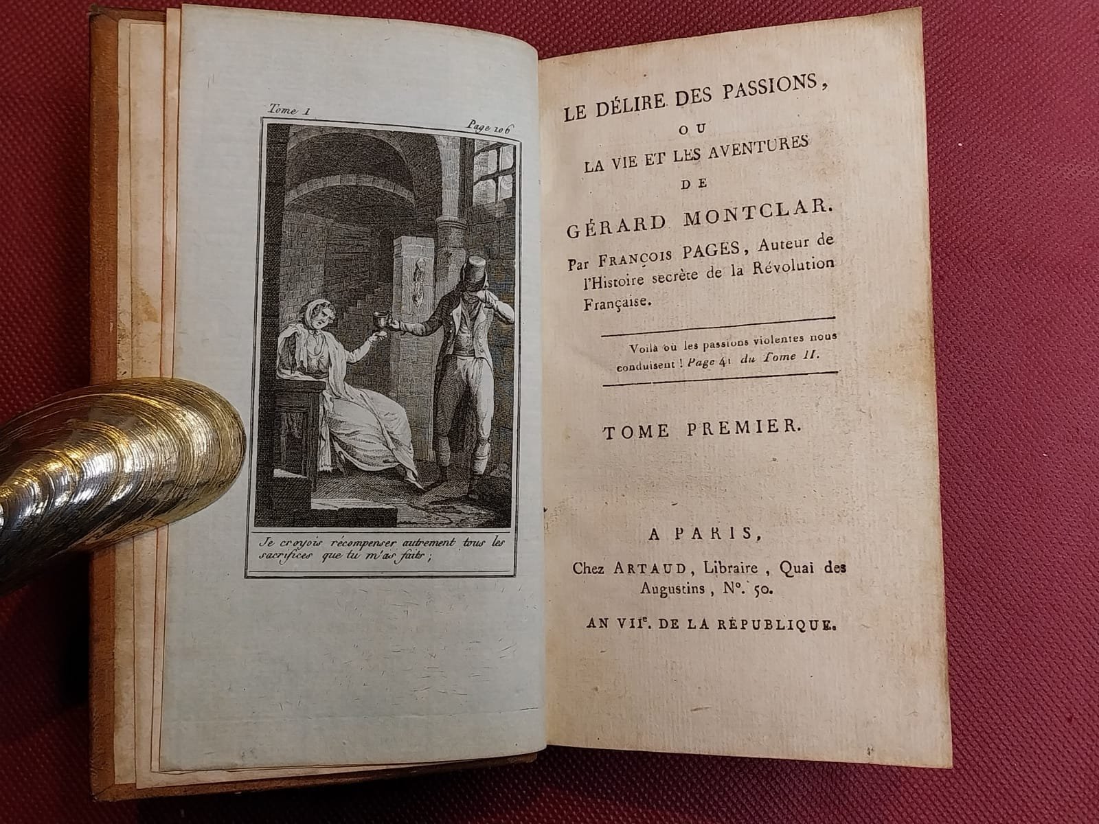 2 tomi in un vol. , pp. (4), 222, (2); (4), 214, 2 tavv. in antiporta incise f.t. su carta azzurrina, legatura coeva in piena pelle color nocciola, dorso liscio, titolo su tassello in marocchio rosso, fregi in oro. Tagli rossi. Buona copia. François-Xavier Pagès de Vixouze (1745-1802). Giacobino, fondatore del giornale 'Le Cantaliste'. Di origini aristocratiche all'inizio della Rivoluzione si trasferisce a Parigi condividendone gli ideali.
