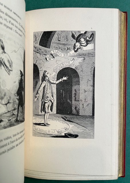 In-8° (223 x 135 mm), pp. LXXXIV, 192, ritratto dell'autore in antiporta e 200 disegni nel testo incisi in legno di Edouard de Beaumont, 6 tavole f.t. della prima edizione. Bella ed elegante legatura in marocchino rosso firmata Reymann Domont, dorso a 5 nervi con titolo e fregi in oro al dorso, ai piatti 7 cornici lineari impresse in oro formano un elegante motivo geometrico, dentelle interna e tagli in oro. Brossure editoriali conservate. Alla sguardia del piatto anteriore sono appplicati tre differenti ex libris di diversi soggetti ed epoche. Prima edizione con lo studio di 80 pagine di Gerard Nerval. La vicenda si svolge tra Napoli (durante la dominazione spagnola), Venezia e l'Estremadura. Alvaro, un giovane capitano spagnolo delle guardie del re, in una serata di bevute, incontra un commilitone che lo introduce ai misteri dell'occultismo e con il quale invocherà Belzebù. Il diavolo coglierà l'occasione per impadronirsi dell'anima del giovane e, assumendo le sembianze corporee di una bellissima giovane, Biondetta, tenterà con ogni arte seduttrice di farlo cadere in tentazione carnale. Ma Biondette s'innamora e ora vuole sedurre il giovane non solo per dovere 'professionale' ma per amore naturale, e lo segue a Venezia mettendosi al suo servizio sotto le sembianze di un paggio, Biondetto. Seguono diverse vicessitudine che portano infine alla vittoria del diavolo. Alvaro si risveglia nel delirio, incerto che la visione notturna fosse reale o solo un sogno. Prima opera fantastica della narrativa francese moderna, Le Diable amoureux del 1772 segue di soli otto anni il primo romanzo gotico, The Castle of Otranto di Horace Walpole, 1764 La lunga introduzione di Nerval pubblicata per la prima volta in questa edizione del 1845 dall'editore Ganivet ( tra l'altro le diable amoreux è l'unica opera firmata Ganivet) tratta di un profilo biografico, intellettuale e letterario di Cazotte. Nerval considera l'autore del Diable come 'le poète qui croit à sa fable, le narrateur qui croit à sa légende' sottolineando il contrasto tra questo atteggiamento e quello di altri scrittori settecenteschi, quali Montesquieu, Diderot e Voltaire, che avevano prodotto con successo racconti in cui entrava in gioco il soprannaturale, ma considerandoli come pure invenzioni, secondo lo spirito dell'epoca, portato a divertirsi dei frutti di un'immaginazione fervida purché essi rimanessero nei limiti tradizionali dei racconti di fate e delle pantomime d'opera. Il racconto ricco di descrizioni dettagliate e di bellissime illustrazioni pregne di simbolismi e analogie. In una tavola viene rappresentato in versione opportunamente blasfema dato il contesto diabolico, il tema artistico sacro dell'Annunciazione: alla finestra con l'Arcangelo e la luce che fiotta sulla stanza di Maria si contrappone il lucernario del diavolo in un'atmosfera ombrosa e sinistra; all'attività di Gabriele che si presenta per portare un messaggio fa da negativo la passività di Belzebù, chiamato dall'evocatore; e così via. Non sappiamo ovviamente se e quanto la provocazione sia voluta, ma Le Diable amoureux in effetti annunzia una nuova dialettica, potremmo dire una nuova economia (non teologica ma letteraria) tra l'uomo e un interlocutore metafisico - in questo caso il diavolo. (Franco Pezzini) Carteret, 1801-1875, III, p.135. Vicaire II 147; PICHOIS, Claude - BRIX, Michel, Dictionnaire Nerval Du Lerot, 2006, p.92