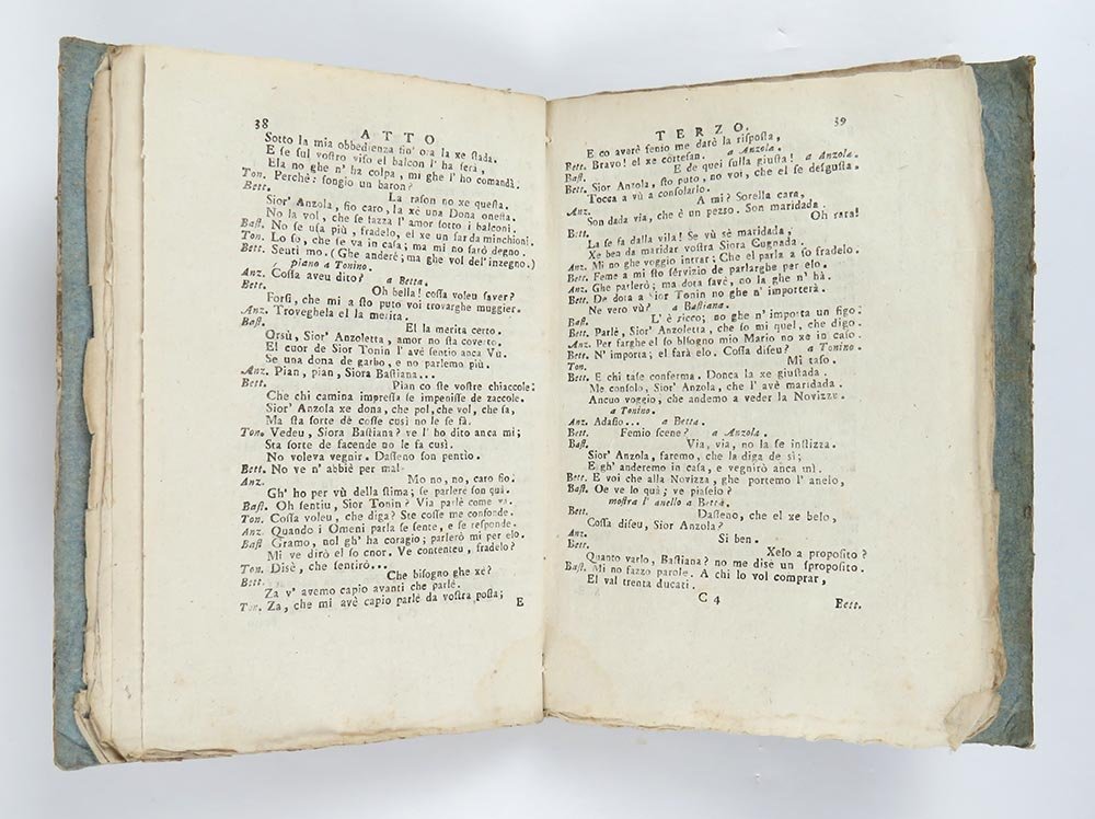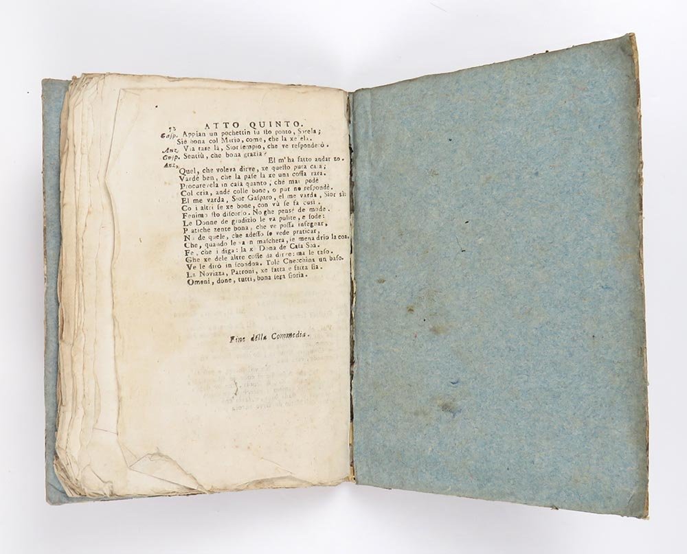 LIBRODistacco dei fascicoli dalla legatura, all’interno esemplare molto bello, marginoso e fresco. Edizione rarissima dell’opera che segna la rinascita artistica di Goldoni dopo l’insuccesso della «Buona famiglia», e che fu rappresentata per la prima volta a Venezia nel 1755. In Oclc solo una copia a Yale; in Iccu solo un esemplare dell’edizione del 1759. Non censita da Salvioni (il quale fa principiare, con parole poco gentili, la serie «Delle Commedie» della Stamperia San Tommaso d’Aquino di Bologna nel 1862: pp. 121ss.), si pone quale interessante testimone tra l’ed. Pitteri (vol 5, 1758) e l’ed. Salvioli (vol 4, 1773).