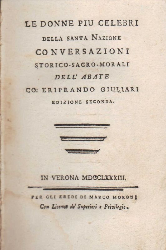 In-8° antico, cm. 18x11, legat. in tutta pelle, pp. 354 + (2) novità editoriali. 'Conversazioni' sulla storia di Eva, Sara, Rebecca, Rachele, Ruth, Giuditta, Ester, Susanna. Leggere abrasioni alla legatura.