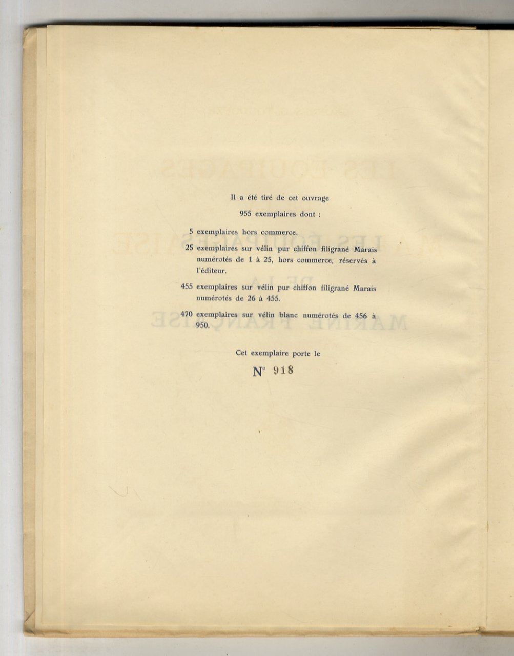 Paris, Le Editions Militaires Illustrées, 1943, in-4, brossura editoriale, pp. 146,[6]. Con illustrazioni in blu n.t. e 19 (su 20) tavole a colori f.t., protette da veline. Edizione di 950 esemplari numerati (n. 918). Esemplare intonso e in perfette condizioni, ma inspiegabilemnte mancante della penultima tavola a colori f.t.