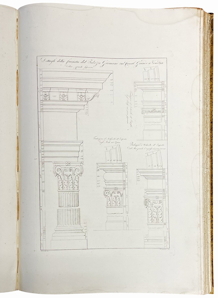 In folio (mm 516x346); pp. 14, 34, 16, [150] c. di tav. calcografiche intercalate nel testo. Mancano le pp. 7 e 8 del secondo blocco di pagine, sostituite da una carta bianca. Occhietto, frontespizio e antiporta incisa da Francesco Ronzani con ritratto del Sanmicheli. Lievi aloni marginali diffusi. Mezza pelle coeva con titolo e piccoli fregi in oro al dorso. Piatti rivestiti con carta marmorizzata. Piccole mancanze al dorso e lunghe le cerniere. Bruciato l'angolo superiore esterno del piatto anteriore e solo minimamente il taglio superiore.