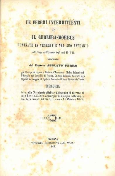 Le febbri intermittenti ed il Cholera-morbus dominate in Venezia e nel suo estuario nella state e nell'autunno degli anni 1848-49. Memoria letta alla accademia medico-chirurgica di Ferrara ed alla società medico-chirurgica di Bologna