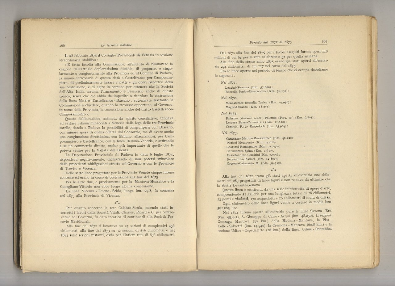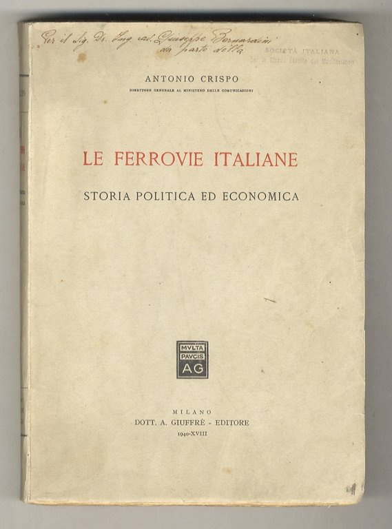 Milano, A. Giuffrè Editore, 1940, in-8, br. editoriale, pp. XII, 394. Il volume si compone di 3 parti: nella 1a la divisione è per aree (ferrovie del Regno delle due Sicilie, del Lombardo-Veneto, del Granducato di Toscana, dello Stato pontificio, dei ducati di Parma e Modena, dello Stato Sardo); la 2a per epoca (dal 1859 al 1905); nella 3a l'autore prende in esame le ferrovie esercitate dall'industria privata, le ferrovie coloniali (in Tripolitania e Cirenaica, nell'A.O.I.), le strade ferrate per uso privato, le tranvie estraurbane. In Appendice: Provvedimenti dal 1905 al 1938 in materia di concessioni ferroviarie. Dono (invio manoscritto) fatto all'Ing. Giuseppe Bernardini dalla "Società Italiana per le Strade Ferrate del Mediterraneo" (questa scritta a timbro). Ottime condizioni.