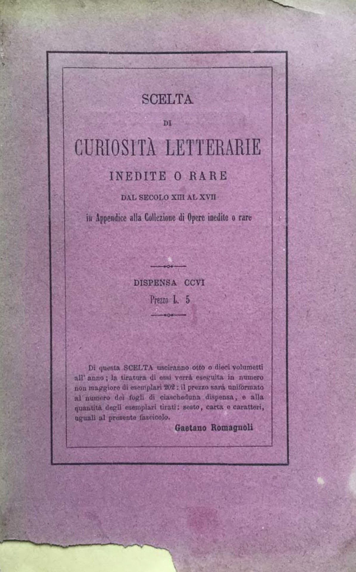 Bologna, presso Gaetano Romagnoli, 1885, in 8vo. Brossura editoriale, 160 pp. Scelta di curiosità inedita o rare dal secolo XIII al XVIII, dispensa 206. Lieve mancanza al piatto anteriore. 945 - V In Ottavi (15-23cm ) Buono (Good) Buono