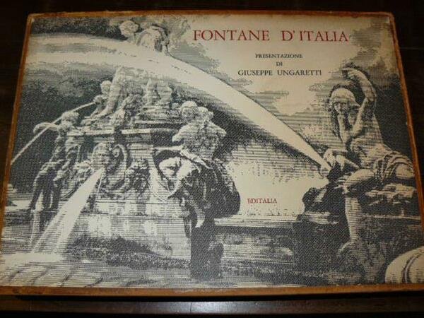 In-4° oblungo (387x270mm), pp. 140 nn., legatura editoriale p. pelle con titolo in oro al piatto superiore entro custodia figurata in cartone con bordi in pelle. Raccolta di 64 disegni a piena pagina riprodotti in tecnica zincografica, raffiguranti le principali fontane italiane. Qualche spellatura al dorso. Esemplare nella tiratura speciale fuori commercio realizzata per la Società Italiana per Condotte d'Acqua. Impresso su carta speciale delle Cartiere Ventura di Cernobbio.