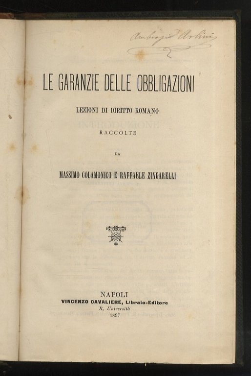 Le garanzie delle obbligazioni. Lezioni di diritto romano raccolte da Massimo Colamonico e Raffaele Zingarelli.