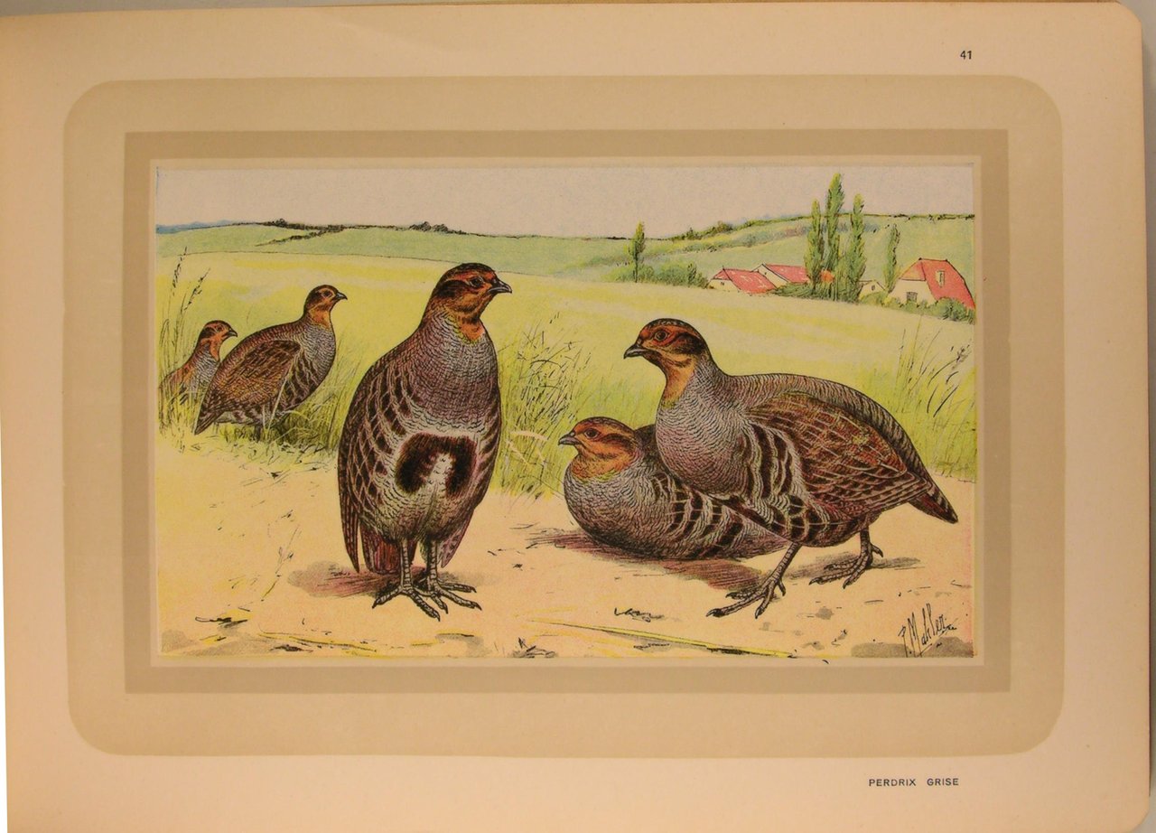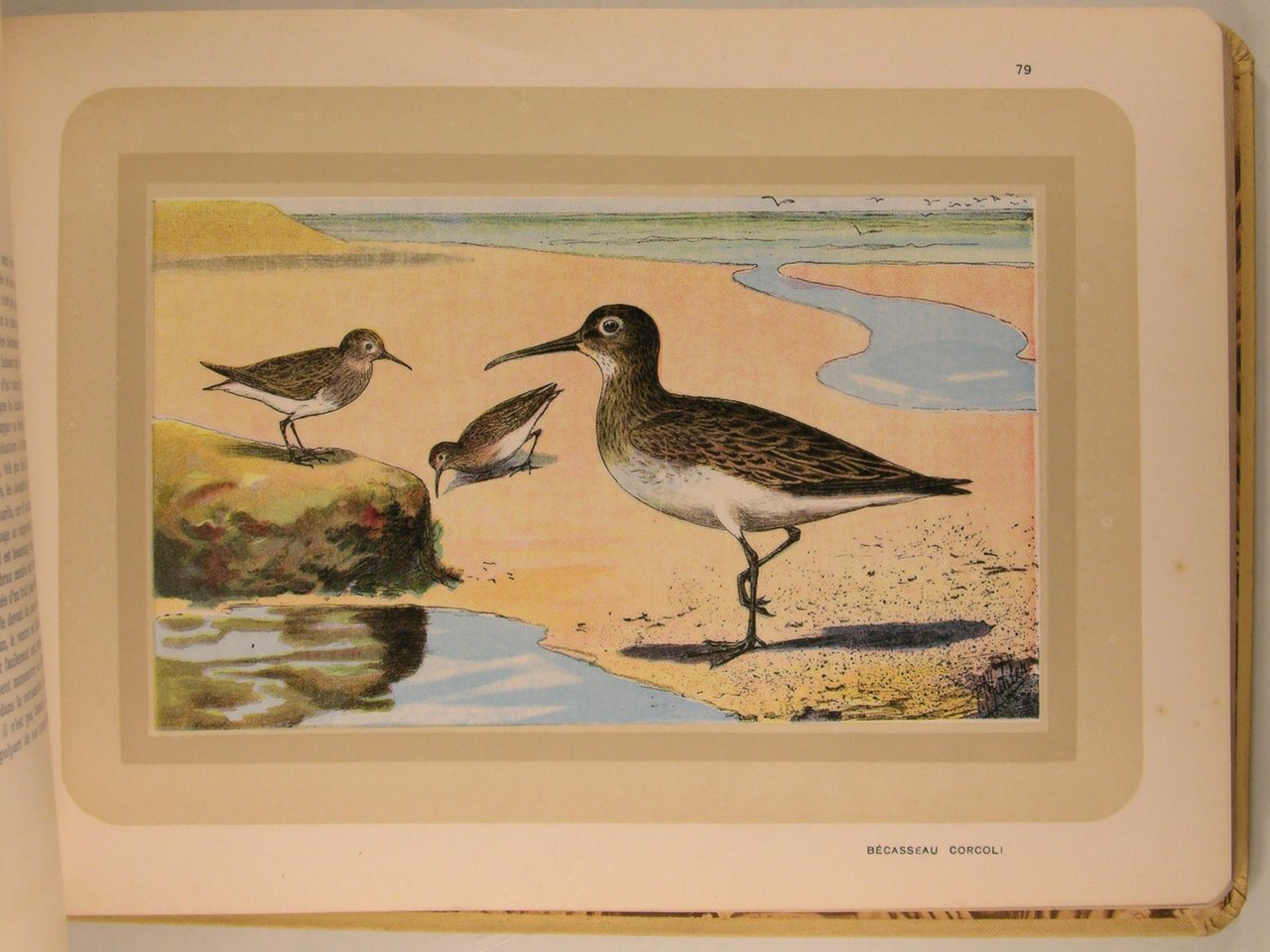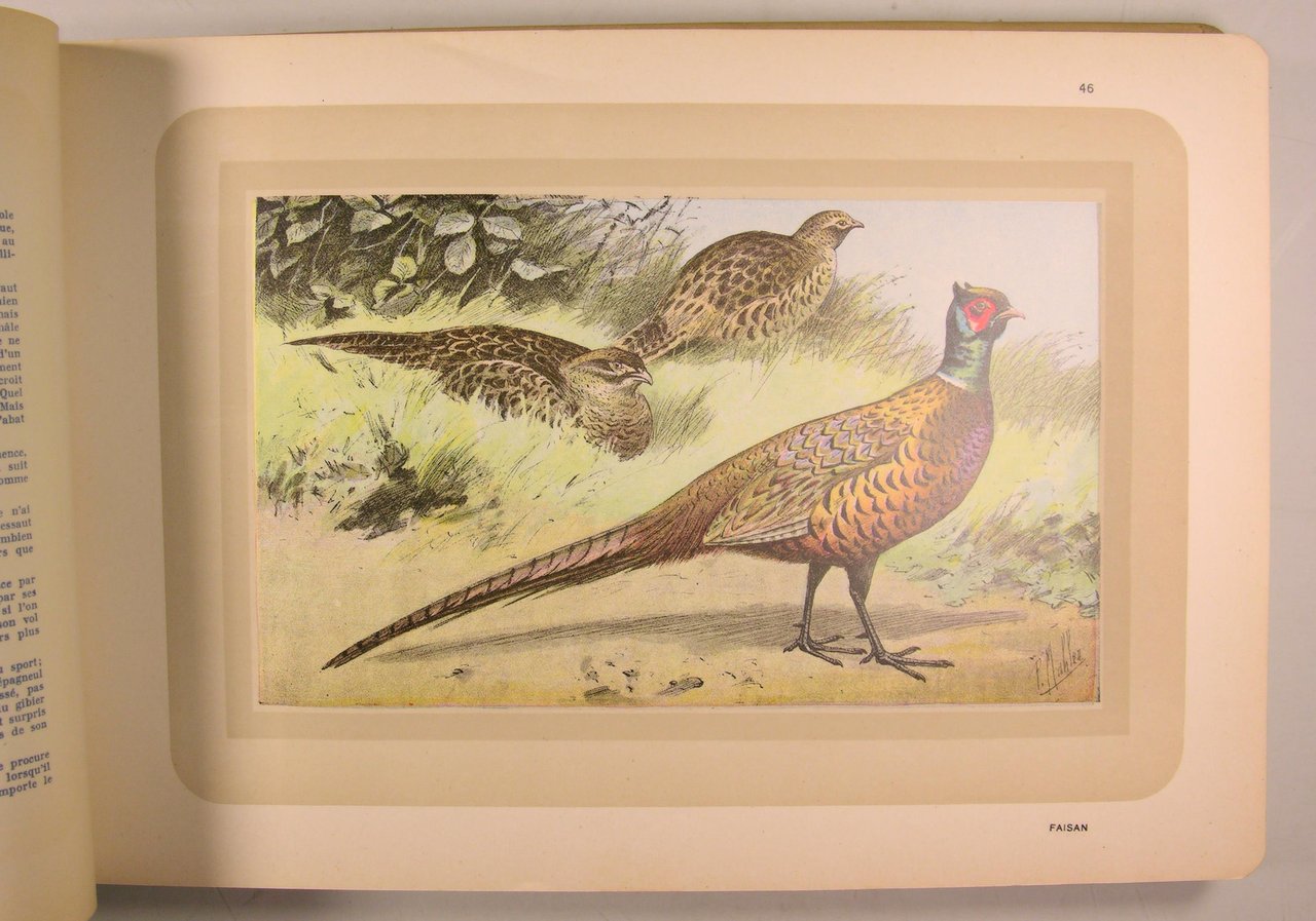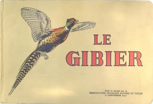 Edité par la Manufacture Française d'Arme et Cycle de Saint-Etiénne, Saint-Etienne, 1939. In/4, reliure éditeur en percaline illustrée, 118 planches couleurs avec serpentes imprimées (dont 6 pl. de catalogue), illustrations par les peintres animaliers Malher et Marcueÿz. Monographies de Samat rédacteur au “Chasseur français” : bécasse, canard, chevreuil, chamois, faisan, lièvre, sanglier, tétras.