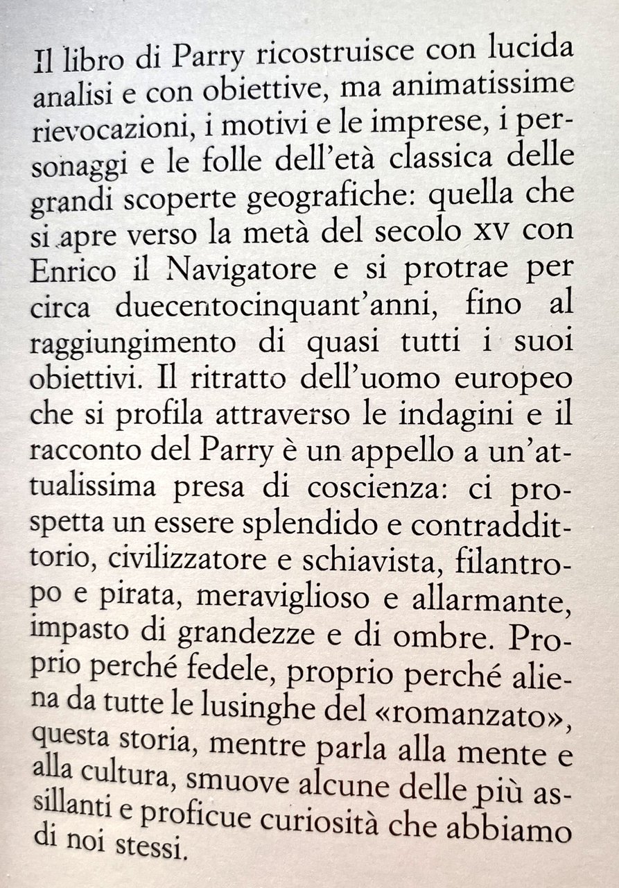 Il libro di Parry ricostruisce con lucida analisi e con obiettive, ma animatissime rievocazioni, i motivi e le imprese, i personaggi e le folle dell'età classica delle grandi scoperte geografiche: quella che si apre verso la metà del secolo XV con Enrico il Navigatore e si protrae per circa duecentocinquant'anni, fino al raggiungimento di quasi tutti i suoi obiettivi. Il ritratto dell'uomo europeo che si profila attraverso le indagini e il racconto del Parry è un appello a un'attualissima presa di coscienza: ci prospetta un essere splendido e contraddittorio, civilizzatore e schiavista, filantropo e pirata, meraviglioso e allarmante, impasto di grandezze e di ombre. Proprio perché fedele, proprio perché aliena da tutte le lusinghe del romanzato, questa storia, mentre parla alla mente e alla cultura, smuove alcune delle più assillanti e proficue curiosità che abbiamo di noi stessi.
