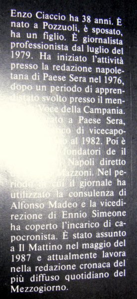 Soggetti: Attualità, Anni Ottanta, Giornalismo, Reportage, Storia e cultura locale, Napoli e provincia, Hinterland, Criminalità organizzata, Interviste, Storie, Appalti, Politica, Clientelismo, Camorra, Pomicino, Gava, Gorbaciov, Carcere, Viscardi, Regione, Libri rari, Vintage Fuori catalogo, Collezionismo, Cronache, Giornalisti, Inviati, Collezionismo, Current affairs, Eighties, Journalism, History and local culture, Naples and its province, Organized crime, Interviews, Stories, Contracts, Politics, Clientelism, Prison, Region, Rare books, Out of print, Collectibles, Chronicles, Journalists, Sent, Collectibles, Stampa, Editoria, Printing, Publishing, Local Newspapers, Cronisti napoletani, Maternità, Ragazze madri, Società, Sussidi, Corruzione, Scandali, Sindaco, Pentiti, Pentitismo, Munnezza, Rifiuti tossici, Traffici illeciti, Assenteismo, Impiegati comunali, Droga, Spacciatori, Terremoto, Ricostruzione, Neapolitan chroniclers, Maternity, Single mothers, Society, Aids, Corruption, Scandals, Mayor, Repent, Pentitism, Toxic waste, Illicit trafficking, Absenteeism, Municipal employees, Drugs, Dealers, Earthquake, Reconstruction
