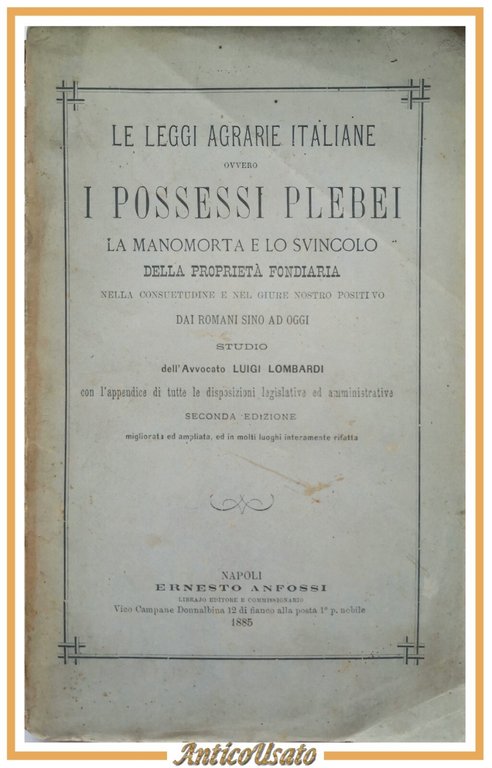 LE LEGGI AGRARIE ITALIANE I POSSESSI PLEBEI di Luigi Lombardi 1885 Libro antico