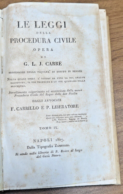 suo trattato e le sue quistioni sulla procedura, novellamente volgarizzata ed accresciuta della nuova procedura Civile del Regno delle due Sicilie dagli avvocati Carrillo e Liberatore. Napoli, dai torchi del Tramater, 1827. 324 + 373 Pagine. Copertina in tutta pergamena con titoli e fregi dorati al dorso. Dimensioni: 13 x 21,5 cm. Stato di conservazione: buono (fioriture, gora d'umido all'angolo superiore di tutto il volume)