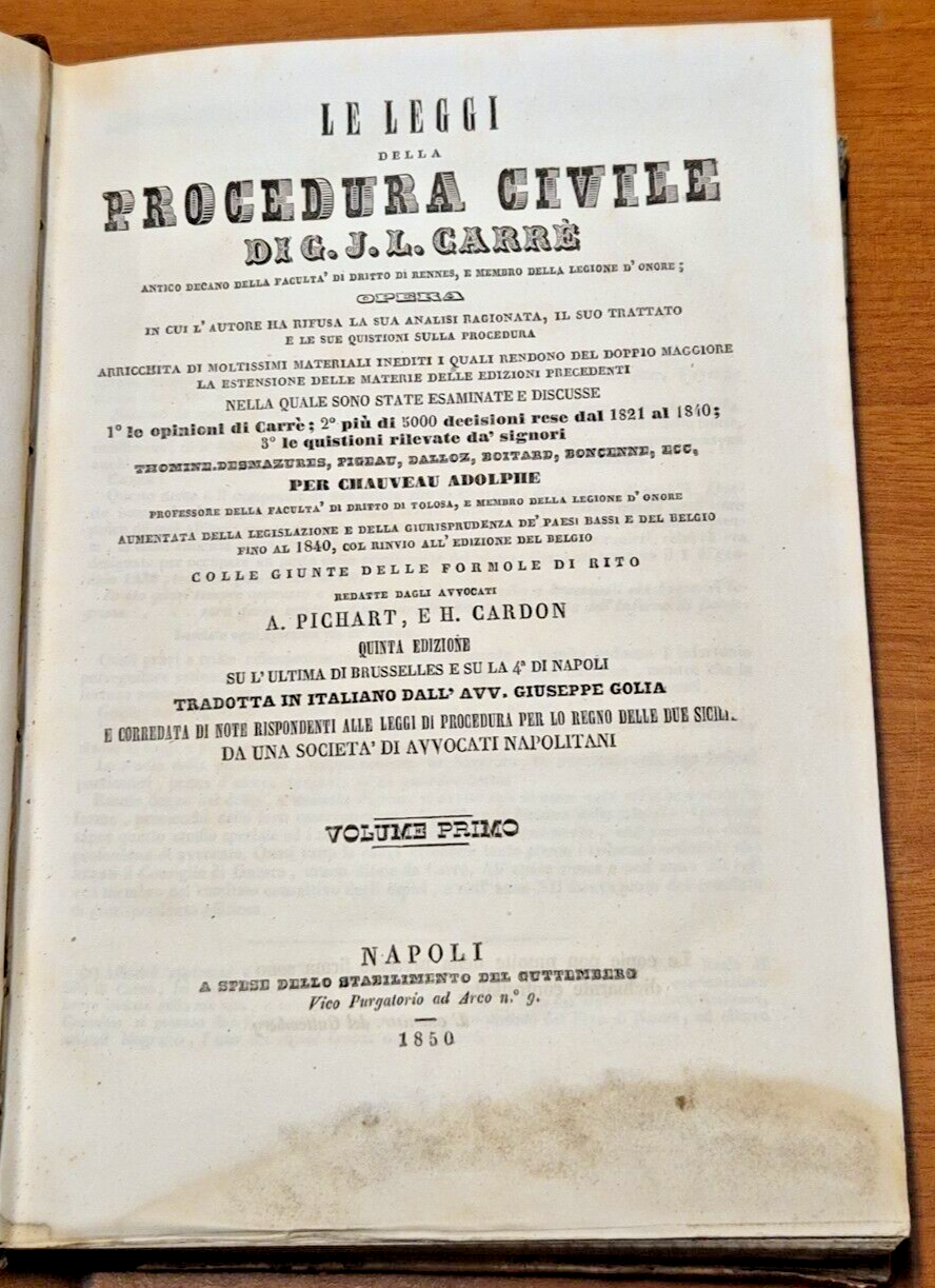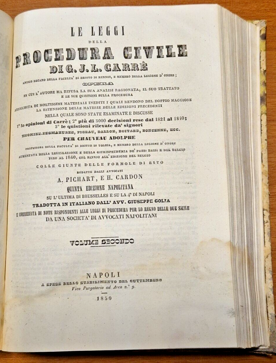 LE LEGGI DELLA PROCEDURA CIVILE volume 1 e 2 di Carrè 1850 Libro antico diritto