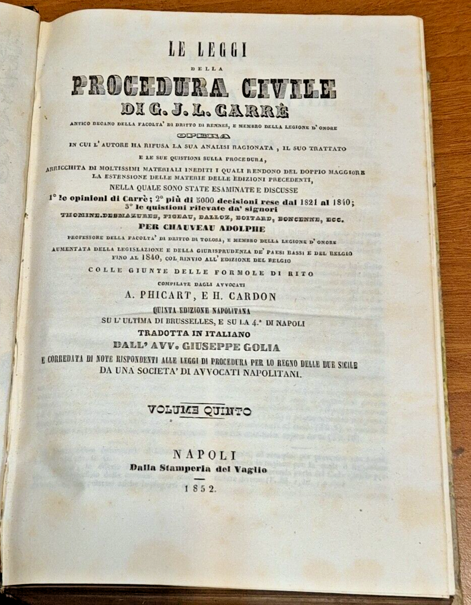 LE LEGGI DELLA PROCEDURA CIVILE volume 5 e 6 di Carrè 1850 Libro antico diritto