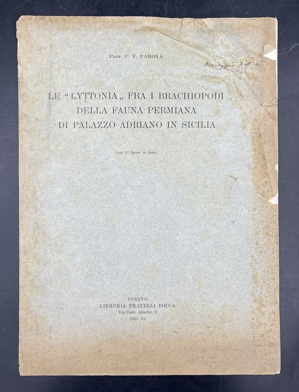 Le "LYTTONIA" fra i brachiopodi della fauna permiana di PALAZZO ADRIANO in Sicilia. Con 27 FIGURE nel testo.· Estr. da: Memorie della Reale Accademia delle Scienze di Torino, vol. 67. (1933), ser. 2. Con INVIO.8cxvii