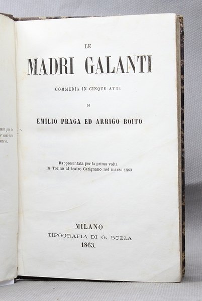 In-8°; 154 pp.; legatura coeva in mezza tela. Buon esemplare. Prima edizione della commedia con cui Boito esordì poco più che ventenne in collaborazione con Emilio Praga.