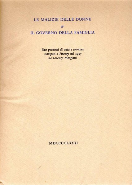 Le malizie delle donne & Il governo della famiglia, prima edizione 1981, pp. 39, formato 17 x 25.<BR>Copertina morbida di colore beige con titoli in nero e blu al piatto anteriore e in nero sul dorso. All'interno due poemetti di autore anonimo stampati a Firenze nel 1497 da Lorenzo Morgiani. Tiratura in 10 copie numerate, nostra copia n. 82. <BR>Ottime condizioni.