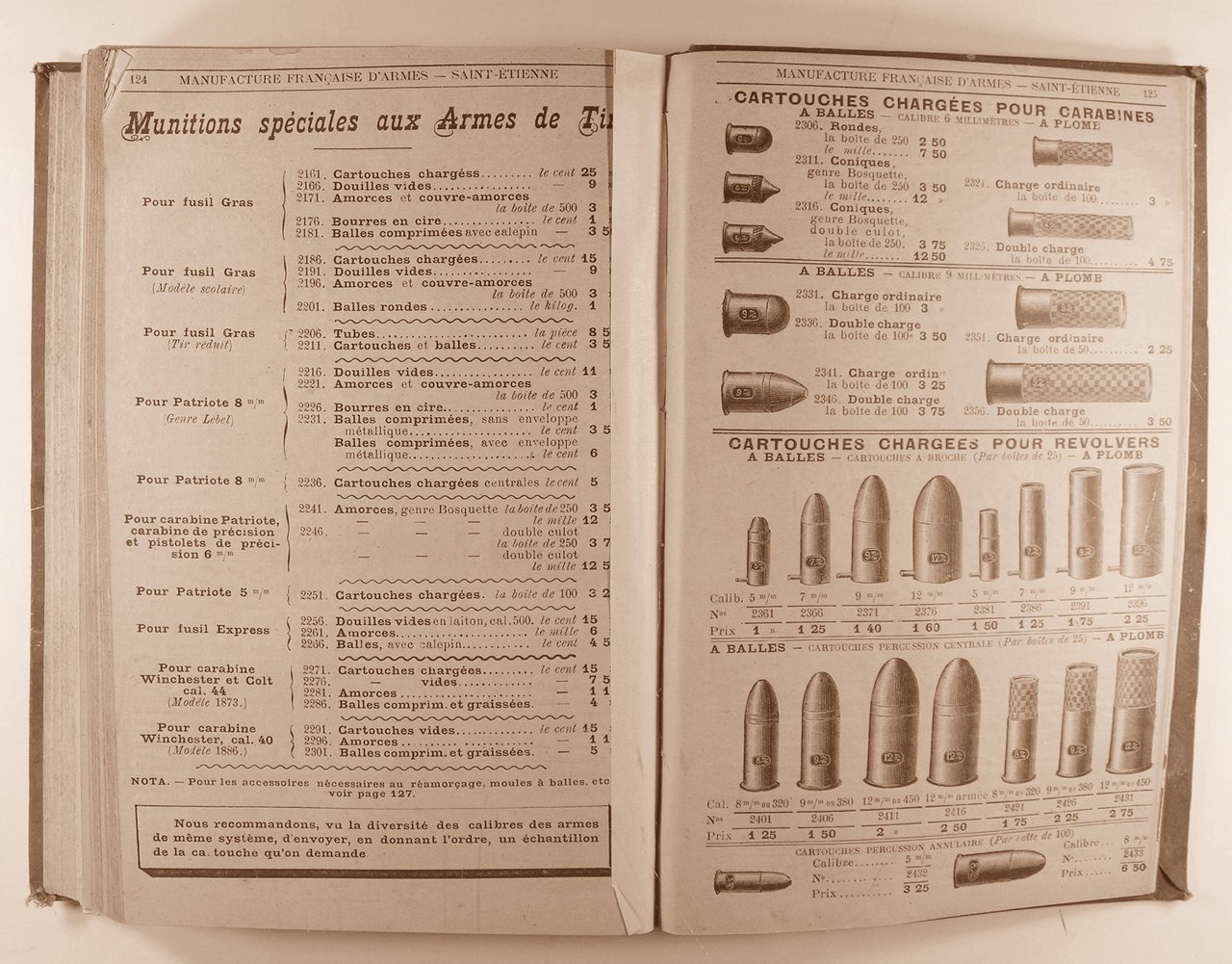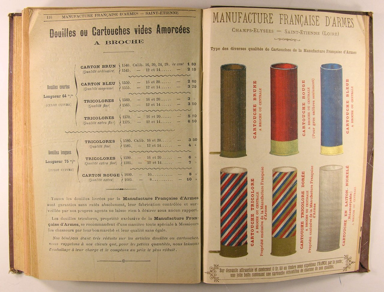Manufrance In/8, pleine percaline éditeur, titre doré sur le premier plat. 360 pages, 1 f. blanc, 204 pages, 2 p. de bons de commande., illustrations : acessoires de chasse, cycles. Percaline avec auréole et déchirure en coiffe inférieure. Divisé en sept parties, dont : Le fusil en théorie et en pratique. Le chien en santé et dans la maladie. Recettes, destruction des Renards. Les 204 dernières p. présentent un catalogue d’articles pour le chasseur, bicyclettes, etc. Thiébaud, 655.