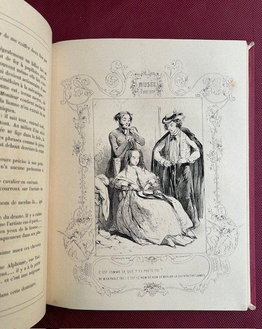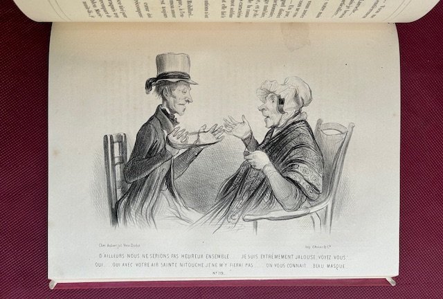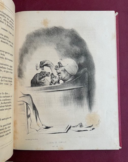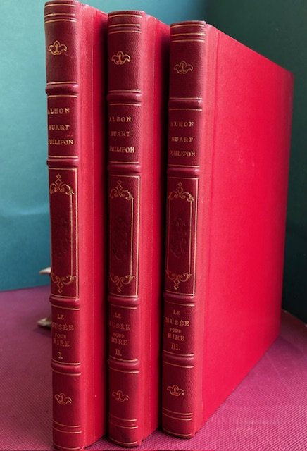 3 voll. in-4° (266 x 204 mm.), pp. 200 n.n. circa per volume150 tavv. litografiche a piena pagina dei più importanti caricatursti dell'880, Daumier, Grandville, Gavarni, Adam, Vernier, Travies, Pigal, Bourdet. in fine di ogni volume vi è un elenco delle tavole. Bella legatura posteriore in mezzo marocchino rosso, titolo e fregi in oro al dorso. Taglio superiore dorato. Lievi bruniture. Nel complesso bell'esemplare. Collezione completa di 150 fascicoli composti ognuno di 4 pp. ed una caricatura in litografia a piena pagina. Carteret III, 426-427. Vicaire, I, 32.
