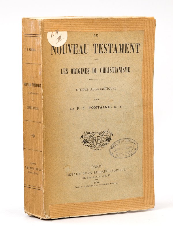 1 vol. in-8 br., Retaux-Bray Libraire-éditeur, Paris, 1890, Etat satisfaisant (anciens cachets et étiq. d'instit. relig., couv. renforcée au papier kraft sur bords, bon état par ailleurs, avec intérieur bien frais). L'auteur était un jésuite breton, qui a notamment enseigné à la Faculté de Théologie d'Angers.