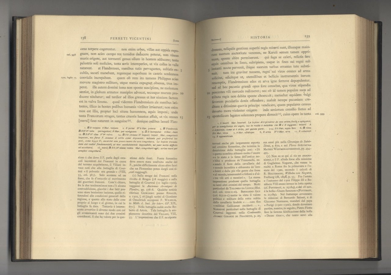 Roma, Forzani e C. Tipografi del Senato, 1908, in-8, legatura editoriale in piena tela, titolo in oro al dorso, pp. [8], 365, [5]. Con due tavole ripiegate f.t. Collana "Fonti per la storia d'Italia. Pubblicate dall'istituto Storico Italiano. Scrittori: secolo XIV". Prima edizione, impressa in 350 esemplari (n. 147). Solo volume primo. Il secondo volume fu edito nel 1914 e il terzo nel 1920. Una erosione alla tela sul piatto posteriore. Timbretti di Biblioteca inglese.