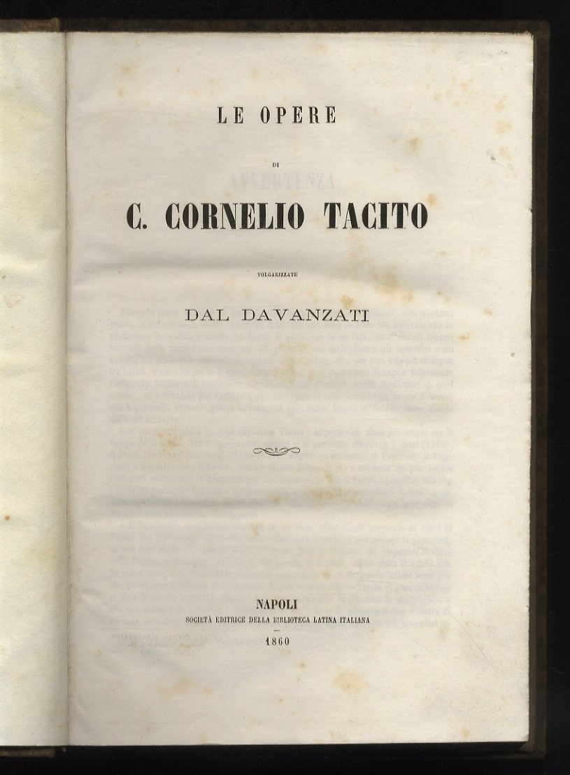Napoli, Soc. Editr. della Biblioteca Latina Italiana, 1860, in-8 grande, bella legatura coeva in piena pergamena maculata, titolo in oro su tassello in pelle rossa e fascette, sempre in oro, al dorso, pp. VIII, 669, (3). Testo latino a fronte. Terzo volume della “Biblioteca latina italiana, ossia raccolta di classici latini con versioni italiane e note”.