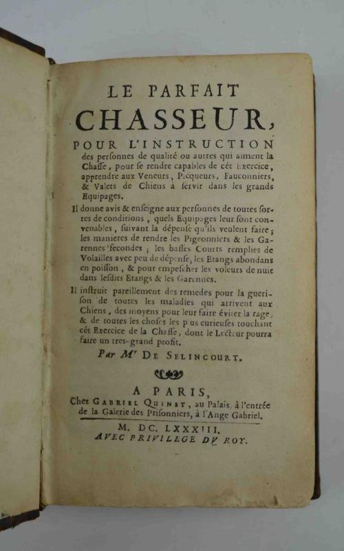 Cm. 15,5, pp. (28) 390 + (2) con il privilegio. Legatura coeva in piena pelle, dorso a nervi con titoli e fregi in oro. Dorature al dorso un po' scolorite e qualche segno d'uso alle cuffie. Appena toccato il margine inferiore delle prime carte peraltro esemplare genuino, pulito ed in ottimo stato di conservazione. Edizione originale ed unica di questo ampio e non comune trattato di caccia. L'opera è dedicata al perfezionamento dell'arte venatoria e contiene importanti novità ed addizioni rispetto ai manuali dell'epoca. La caratteristica che lo contraddistingue è ad esempio la quantità di notizie riguardo alle cacce fuori dai confini nazionali; capitoli sono dedicati alle caccie in Africa, Asia, America e perfino alla caccia della balena. Vi sono poi le istruzioni per allevare, curare ed istruire i cani da caccia, sulla caccia alla volpe, ecc. Cfr. Souhart 433: "Ouvrage assez estime', devenu peu commun"; Thiebaud 836: "Ouvrage tres estime' et fort rare . Petit consacre une longue note a' Selincourt ."; Schwerdt I, 163: "First edition, rare . The most interesting part . would seem to be the table, which gives a list of the various forms of hunting as practiced in the different countries of Europe at that date ."; Harting 165: "This little volume is now of some rarity. The author gives sound advise as to the hawks to be used according to the nature of the country in which they are to be flown".