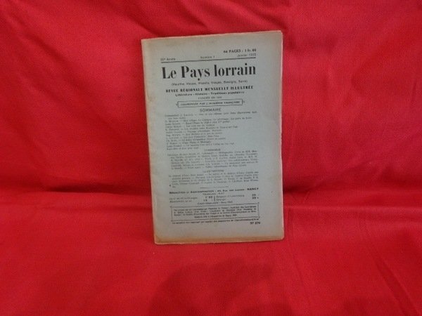 Nancy, le Pays Lorrain, 1931; in-8, 48 pp., couverture verdâtre et cahiers agrafés. Sommaire : Pierre BOYÉ : Les Grands-parents paternels de J.-J. Grandville étaient-ils comédiens du roi Stanislas ?, p. 281./ F. MATTENET : Au Pays du fer – 2ème partie, p. 290./ Marcel MAURE : Souvenirs du général baron de Vincent – 6ème et dernière partie. La Révolte des Pays-Bas sous Joseph II (1789-1790), p. 302./ Vital COLLET : Une aventure singulière, p. 310./ Charles LAURENT : La Phémie r'vint de lé noce (patois de Ligny) – 2ème partie, p. 314./ Chronique : A. LALLEMAND : Chronique du Pays messin, p. 317./ Gustave GINSBACH : Chronique luxembourgeoise, p. 318./ Pierre XARDEL : La Lorraine à l'Académie, p. 320.