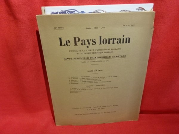 Nancy, Le Pays Lorrain, 1951; in-4, 48 pp., couverture beige et cahiers agrafés. Sommaire : Fernand Baldenne : Avant-Propos, p. 1./ François-Georges Pariset : Deux dessins de Jacques de Bellange au Musée lorrain, p. 3./ Jean rigault : Metz dans l'oeuvre de Louis Bertrand, p. 19./ André Jacquemin : Etienne Cournault (1891-1948), p. 27./ Jean Schneider : En parcourant les terroirs des villages lorrains, p. 33./ Variétés-Chronique : Urbain Noirel : Lo pohhé sévant (Le cochon savant) (Souvenir de guerre 1939-1945), patois de Létricourt, p. 42./ *** : Chronique de la Société d'Archéologie lorraine et du Musée historique lorrain, p. 45./ *** : Nouvelles lorraines, p. 46. Quelques illustrations en noir et blanc.