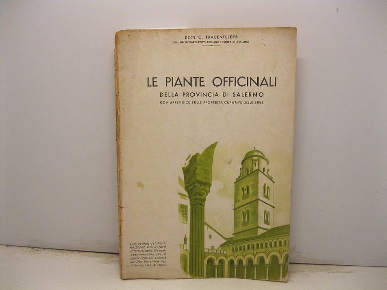 In 8, pp. 104 + (4) con ill. n.t. Timbretto al front. di ex possesso. Mancanze al dorso. Br. ed. Interessante pubblicazione contenente l'elenco delle piante officinali del salernitano con le caratteristiche botaniche, il periodo di raccolta, l'essiccamento, le proprieta' medicinali. Compaiono anche illustrazioni nel testo che raffigurano alcune piante.