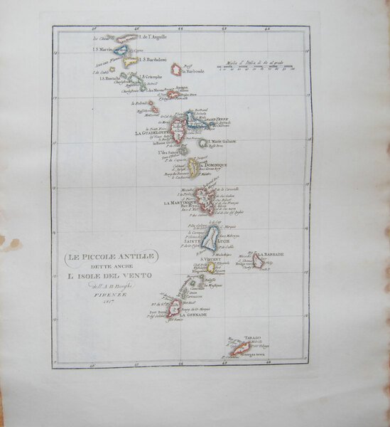 S.e., 1817. Bella carta geografica raffigurante l'arcipelago caraibico delle Piccole Antille, tratta dall'atlante del Borghi. mm 320x240 su foglio di mm 470x360. In ottimo stato (fine copy)