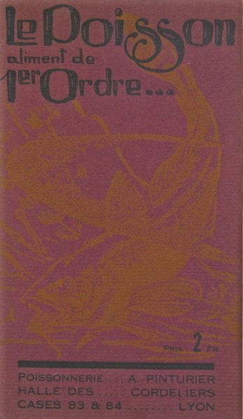 Editions Marcel Gourgoulin, Messia (Jura), s.d. Plaquette in/8 oblong, couverture illustré sur papier cartonné, petites vignettes illustratives, 21 p. Plaquette publicitaire édité par la Maison Pinturier Poissonniers aux Halles de Lyon.