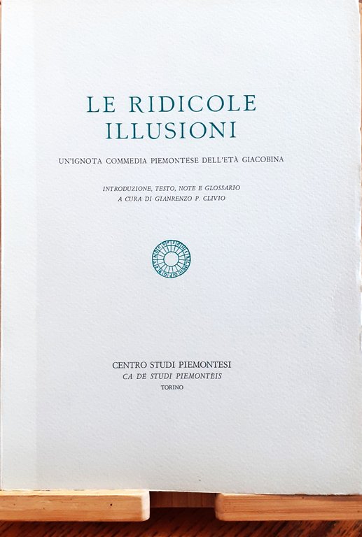 I ed.. Collana di testi e studi piemontesi diretta da Gianrenzo P. Clivio,1. VIII/ XXIV + 92/ brossura in cartoncino ruvido avorio con grafica in nero e verde. Stato buono (lieve usura della copertina - copertina leggermente brunita e polverosa - quasi interamente intonso). Indice: Premessa - Introduzione - Le ridicole illusioni (Personaggi - Prologo - At prim - At second (Sonet) - At ters (Sonet)) - Glossario - La grafia piemontese moderna.