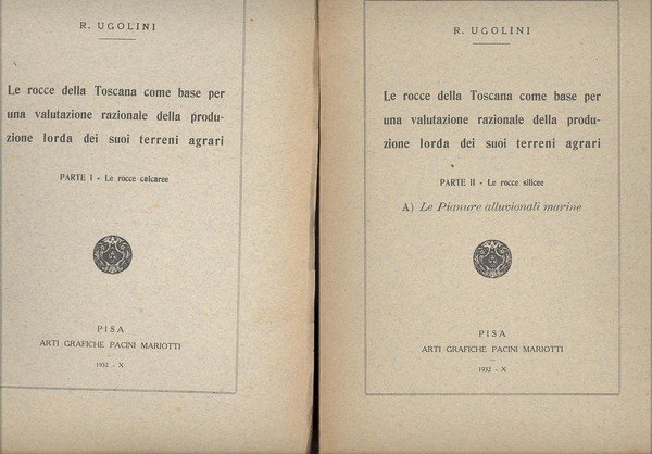 DUE VOLUMI IN 8°. VOL.I ) pp.1 - 86. VOL.II ) pp.87 - 181. COPERTINE EDITORIALI CON TITOLO.<BR>ESTRATTO DAL BOLLETTINO DEL R. ISTITUTO SUPERIORE AGRARIO DI PISA. VOLUME VIII -<BR>1932 - X. OTTIMA CONSERVAZIONE, INTONSO. ID 3679