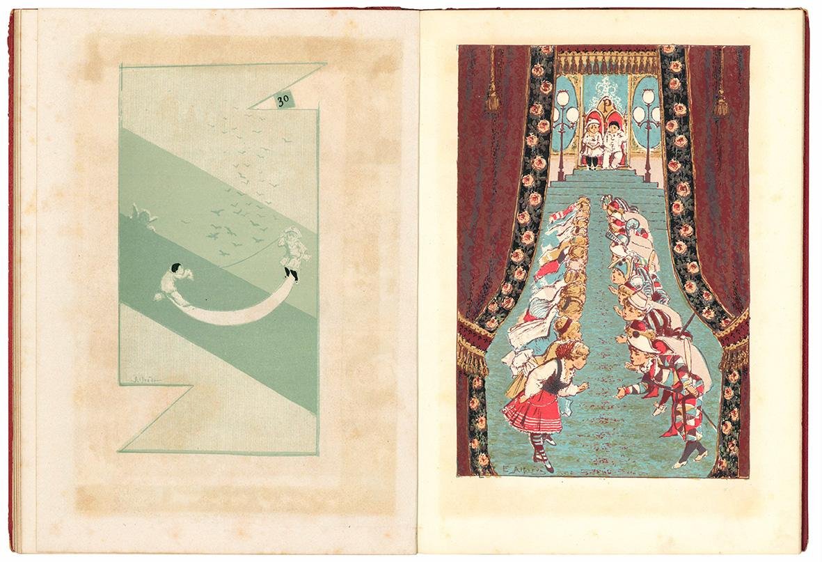 In 4to (mm 279x200); pp. 75, [1]. Numerose illustrazioni litografiche a colori a piena pagina e numerose vignette a contorno dei testi musicali. Fioriture diffuse. Mezza tela editoriale. Illustrazioni litografiche a colori applicate ai piatti. Minime mancanze marginali. Grazioso album musicale di Giulio Ricordi (1840-1912), la cui verve musicale ben si coniuga con le illustrazioni di Alfredo Edel (1856-1912), tra i maggiori collaboratori della casa Ricordi fino al 1890, quando si trasferì a Parigi consolidando la sua fama di illustratore e costumista teatrale.