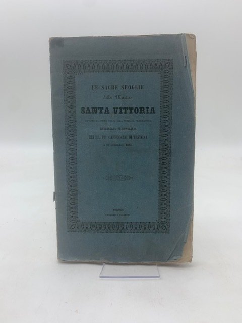 In 8 (cm 13,5 x 21,5), pp. 35 + (5) con 5 tavole fuori testo incise in litografia. Brossura editoriale con mancanze risarcite ai piatti e al dorso. Saggio in cui è raccontata l'esposizione delle spoglie della martire Santa Vittoria nella Chiesa dei Cappuccini di Testona il 10 settembre 1843 (all'antiporta compare la tavola illustrata con le spoglie della Santa). Seguono cenni storici su Testona, presso Moncalieri (Torino) e sul suo santuario di cui compare una tavola con vedutina illustrata da Giuseppe Maria Borri. Il monastero dei Cistercensi Foglianti di Testona fu soppresso nel marzo 1801 durante la Repubblica francese. Con la caduta di Napoleone nel 1814, venne ristabilito l'antico ordine ma nel Monastero non fecero ritorno i Foglianti bensì i religiosi Cappuccini che già da qualche tempo vi dimoravano. La loro presenza durò a Testona fino al 1875. Le ultime 4 pagine non numerate comprendono la Relazione dei festeggiamenti di Santa Vittoria e una Lode della Santa di Silvio Pellico.