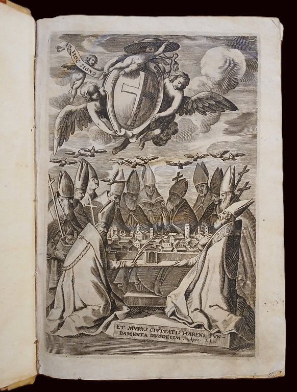 Volume in 4° antico (cm 22 x 15,5), legatura tardo ottocentesca in mezza pergamena, dorso muto con filetti a secco, carta pavone ai piatti. Prima edizione divisa in due parti con frontespizi propri, pp. complessive (32),591,(1), con bella antiporta incisa in rame e un repertorio iconografico in xilografia con fregi, capolettera e finalini ornati e figurati, 32 stemmi di vescovi e cardinali di Ravenna nel testo.