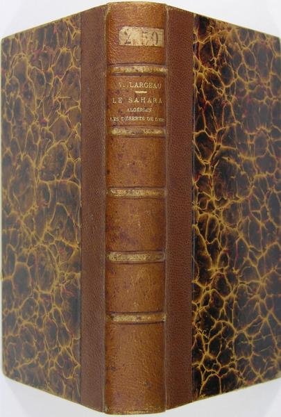 Librairie Hachette, Paris, 1881. In-12 (18 x 12 cm) reliure demi-chagrin havane, dos à nerfs à titre doré, 17 illustrations et 3 cartes, 352 p. Seconde édition revue et corrigée. Victor Largeau (Niort 1840 - 1897) fut un explorateur qui fit deux tentatives de traversée du Sahara. Il écrivit “Le Sahara” en 1870, puis le "Le pays de Rirha - Ouargla - Voyage à Rhadamès" en 1879. Il voulait faire en sorte que les caravanes venant du Soudan aillent vers l’Algérie plutôt que vers le Maroc ou la Tripolititaine. Son fils, militaire lui succédera dans cet intérêt pour la terre Saharienne : il aura un rôle décisif dans la colonisation du Tchad.