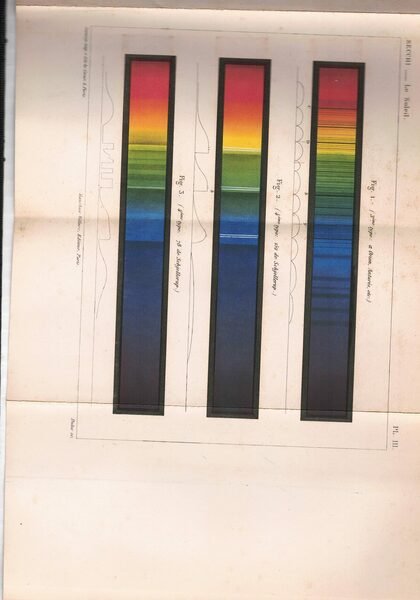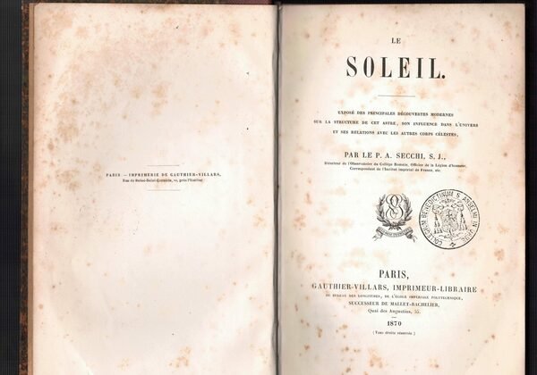 In 8°,mezza tela ,XVI, 422 pages, demi-chagrin rouge à coins de l'époque, à la bradel, dos lisse, Première édition, rare. 3 planches repliées dont 2 en couleurs représentant les spectres lumineux de quelques corps célestes, ainsi que quelques belles figures gravées sur bois dans le texte, dont certaines furent rehaussées à la main.Très bel exemplaire de cet ouvrage de vulgarisation scientifique sur le soleil