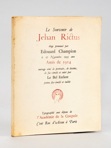 Ouvrage orné de portraits, de dessins, de fac-simile et suivi par Le Bel Enfant poëme fac-similé et inédit, un des 500 exemplaires sur Vergé d'Arches numéroté, 1 vol. grand in-8 br., Typographié aux dépens de l'Académie de la Coupole, Paris, 1934 Bon exemplaire (portrait de Rictus contrecollé en seconde garde, très bon état par ailleurs)