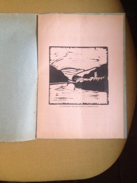 In 8° pp. 18 con ill n/t e 1 tavv. xilografica di Viani su carta rosa (La valle del Lima), br. edit. illustrata con xilo di Viani.